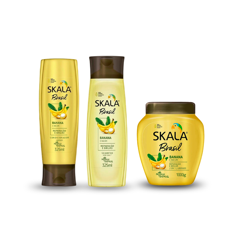Skala Banana y Bacuri es una crema nutritiva 2 en 1 que tiene un fuerte poder hidratante, ideal para reparar y recuperar el brillo natural y previene la caída.
